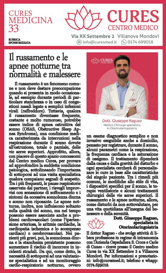 Approfitto, allora, con piacere di questo spazio concessomi dal Centro medico Cures, per provare ad approfondire la suddetta condizione patologica, sottolineando l’importanza di sottoporsi ad una visita specialistica qualora compaiano segnali di sospetto. Tra i più frequenti, le pause respiratorie osservate dai partner, i risvegli improvvisi con sensazione di soffocamento e i sintomi da eccessiva sonnolenza diurna e sonno non riposante.