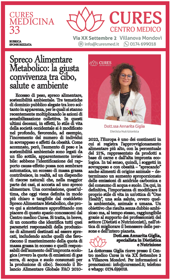Una correlazione, quest’ultima, che oggi viene definita in modo più chiaro e tangibile dal cosiddetto Spreco Alimentare Metabolico, che provo qui a sintetizzare approfittando con piacere di questo spazio concessomi dal Centro medico Cures. Si tratta, in breve, di un concetto che identifica tutti quei parametri responsabili della produzione di alimenti destinati ad essere sprecati, includendo anche quelli che favoriscono il mantenimento della quota di massa grassa in eccesso e quelli responsabili dell’aumento dell’impronta ecologica (ovvero la quota di emissioni di gas serra, di acqua e suolo consumati per la produzione di cibo).